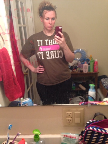 Not the best lighting and it's the only pic of myself that I took. Wearing (I think) my white breast cancer awareness t-shirt and probably pj pants.